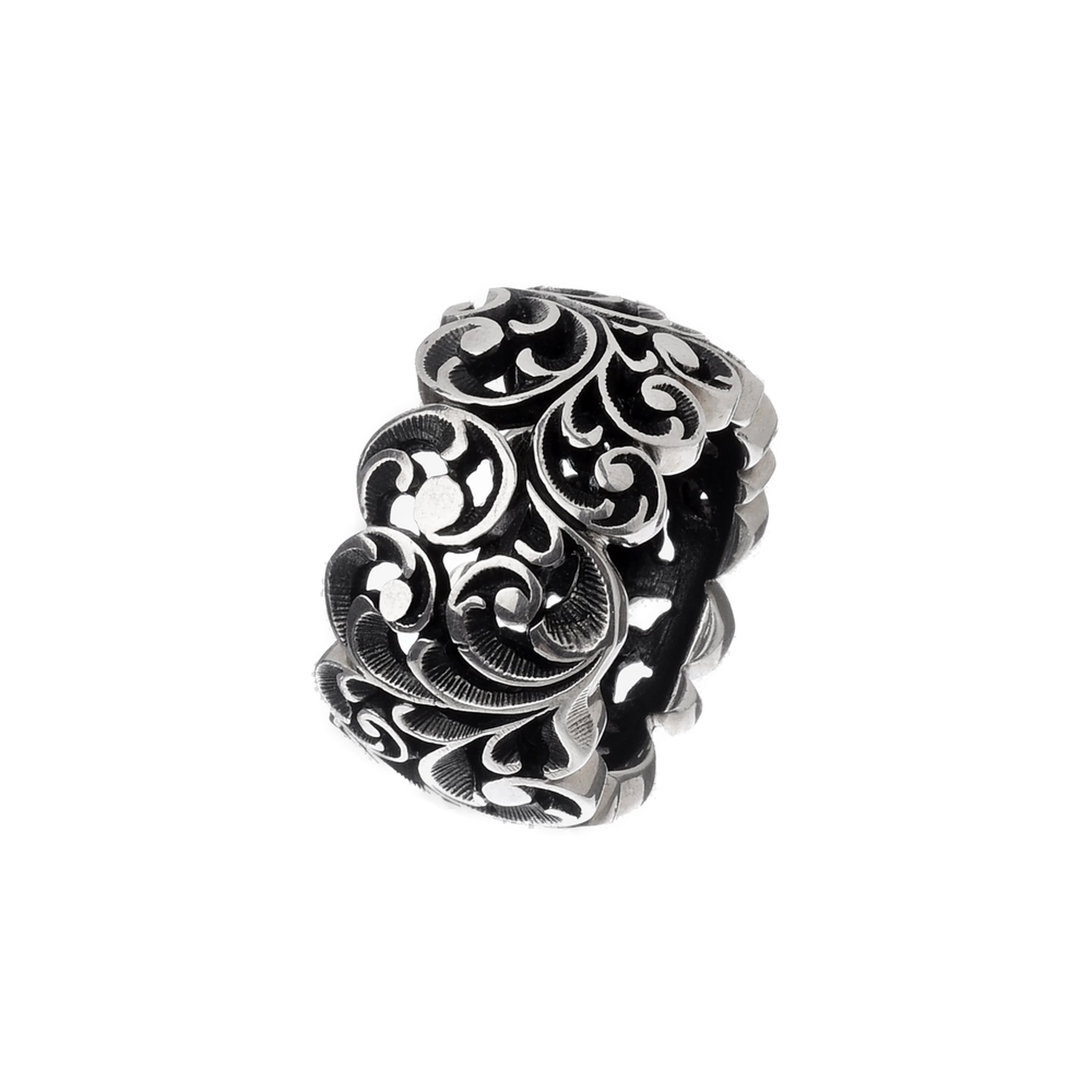 Anello in argento brunito, realizzato da maestri orafi italiani, inciso con l’antica tecnica del bulino che ne esalta l’alto valore artigianale rendendo l’intarsio la cifra stilistica del brand. La singolare sospensione tra luce ed ombra conferisce mistero e morbidezza al metallo. Larghezza fede: 1,5 mm.