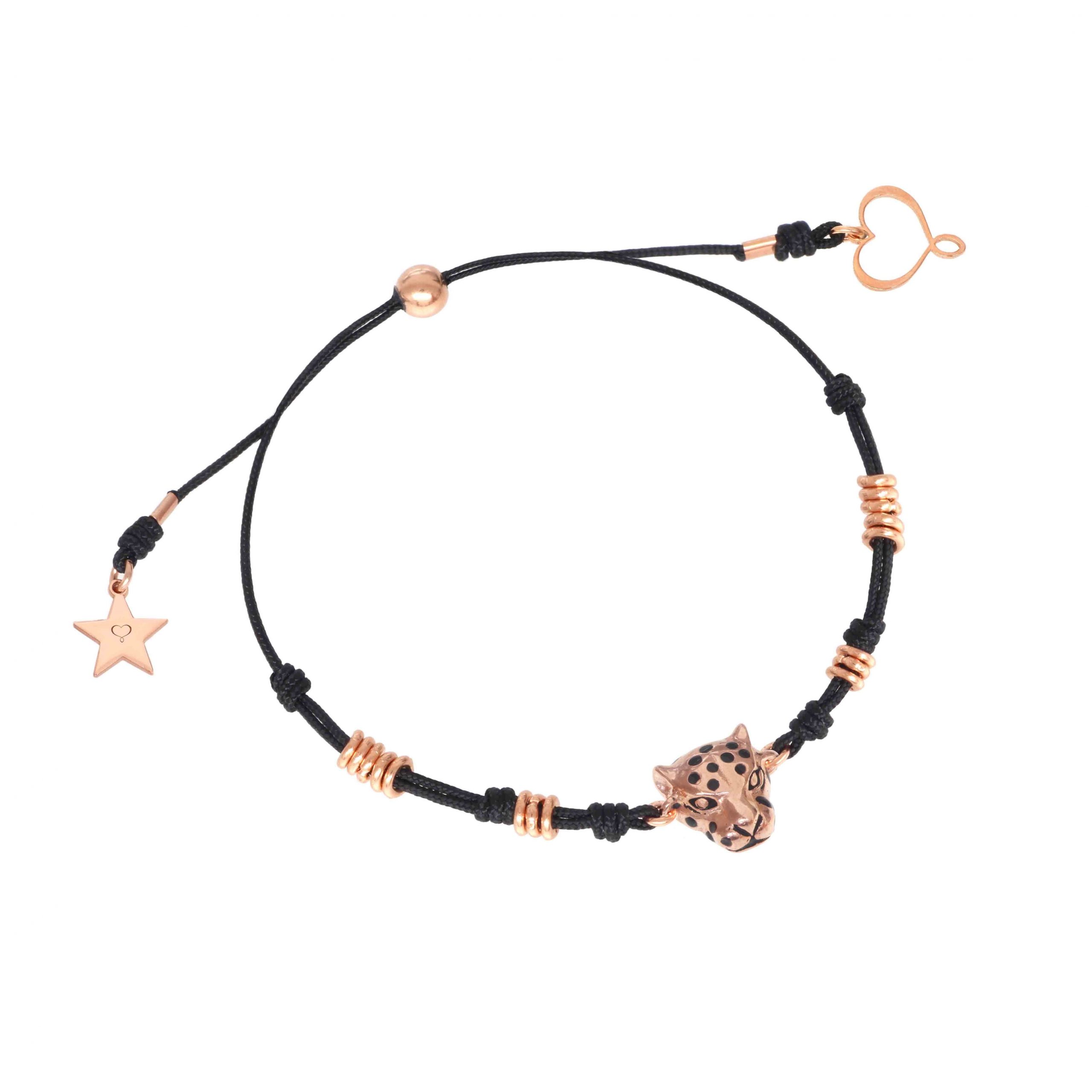 Bracciale di filo di nylon nero con piccoli nodi alternati a maglie. La testa di leopardo è in argento 925 placcato in oro rosa ad alto spessore ed alta resistenza. La dimensione della circonferenza è regolabile grazie alla piccola sfera in argento placcato oro rosa fino ad un massimo di 22 cm.