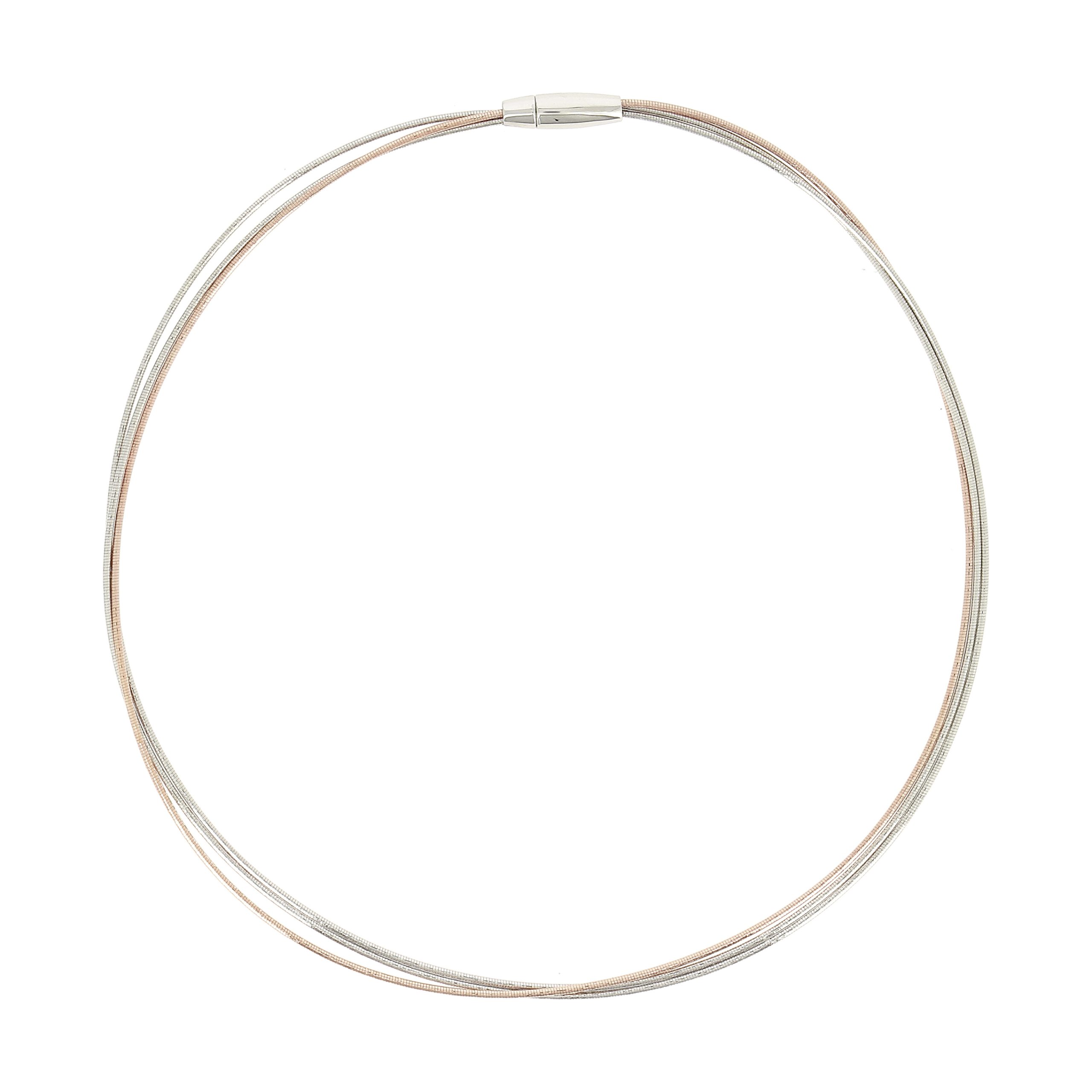 Collana in argento rodio e rosa. DNA Spring è il risultato di un complesso Know How grazie al quale è possibile creare una catena d’argento 925 a forma di spirale e sorprendentemente elastica che genera una piacevole sensazione di leggerezza e morbidezza.